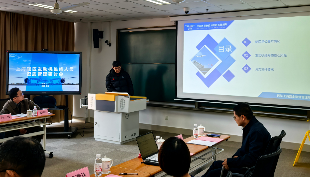 随后,辖区各相关企业依次就发动机维修技术与人员资质管理工作进行了专题汇报。春秋航空维修航线中心总经理张志瑜系统介绍了该公司发动机维修人员资质管理体系建设情况。通用电气(GE)发动机现场支援(上海)有限公司质量经理李知均详细介绍了该公司的发动机快修服务,阐述了其在快速响应、异地排故、车间快修、技术支援等方面的服务能力,并系统说明了从技术员到放行人员的成长路径与资质要求。金鹏航空总工程师王小龙聚焦老龄飞机发动机的技术状态管控与风险管理,分享了公司在应对老龄发动机特殊挑战方面的宝贵思路。