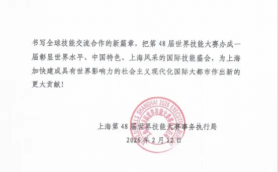 信中指出,2026年2月2日至5日,第48届世界技能大赛准备周会议在上海圆满举行。作为赛事筹备进入冲刺阶段的重要里程碑,会议期间,来自68个成员国家和地区的1000余名代表齐聚上海,围绕64个赛项、1.2万余个基础设施细节开展了高效、专业、精细的技术对接,全面凝聚了办赛共识,明确了技术标准。与此同时,执行局还精心策划组织了系列特色活动,充分展示了上海卓越的办赛能力与深厚的城市文化魅力。