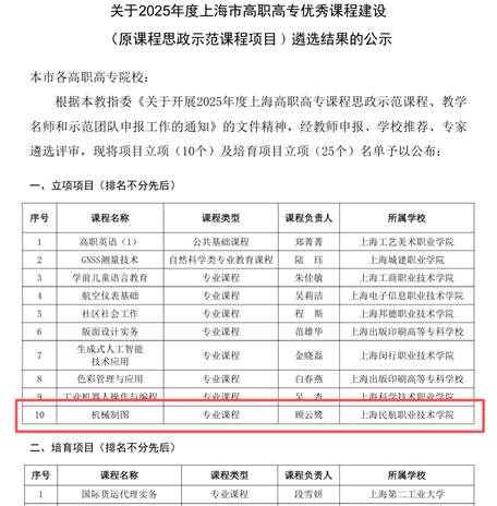 近日,上海市高职高专课程思政与文化素养教指委公布2025年度上海市高职高专优秀课程建设(原课程思政示范课程项目)名单,我院飞机制造与维修学院《机械制图》课程成功入选立项项目,并荣获“课程思政示范团队”称号。本次全市仅立项10项,竞争激烈,成绩来之不易。成果由顾云鹭、周文静、杜玮、王诚等五人团队打造,夜以继日打磨文本、反复推敲案例,最终绘就“一条主线、四个维度、十六案例”的育人范式。
