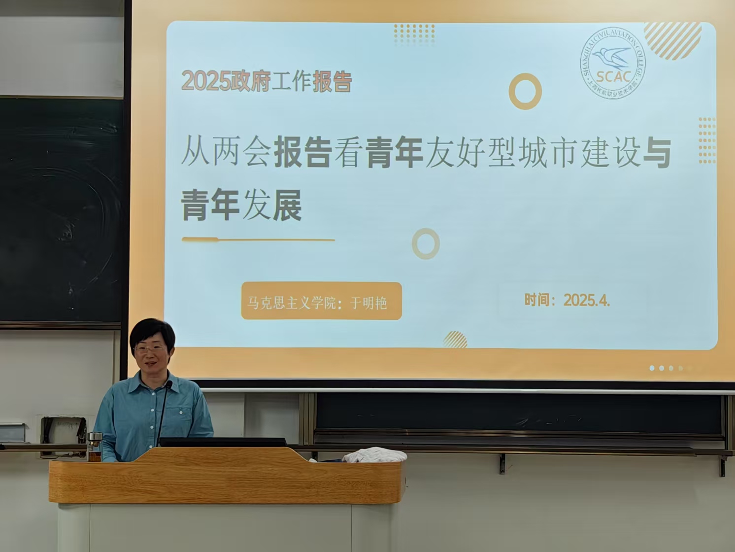 飞机制造与维修学院党总支于2025年4月8日在浦东校区北2107教室开展业余党校第十七期党课基础班第四讲,今日的党课主题是“从两会报告看青年友好型城市建设与青年发展”,由马克思主义学院的于明艳老师主讲,全体同学聆听。