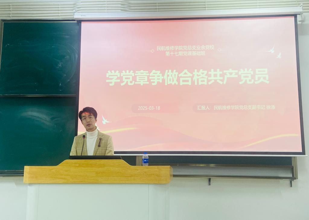 民航维修学院党总支于2025年3月18日在浦东校区北2107教室开展业余党校第十七期基础班第一讲,今日的党课主题是“学党章争做合格共产党员”,由民航维修学院党总支副书记徐添老师,全体学生聆听党课。