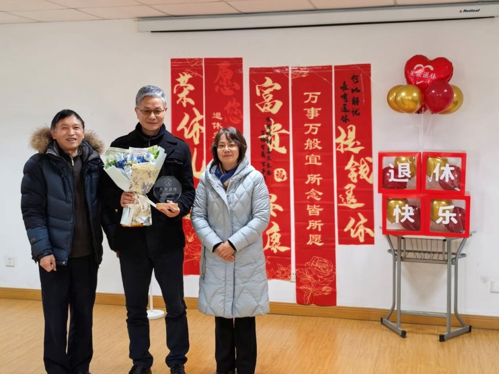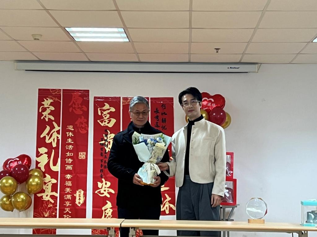 仪式现场暖意融融,随后罗玉梅副院长代表学院向陈金弟老师郑重颁发退休证,见证他职业生涯的圆满落幕;吴碧莹代表学院工会送上精心准备的纪念品,传递组织的关怀与温暖;徐添代表党总支献上鲜花与蛋糕,寓意陈老师退休生活甜蜜安康、芬芳常伴。