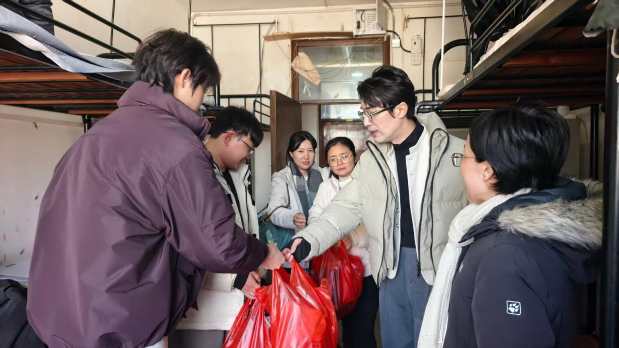 徐添一行还为留校学生送上了新年大礼包,并结合近期天气变化,叮嘱同学们注意防寒保暖,合理安排作息时间,增强安全防范意识,尤其在外出出行、用电用火、宿舍安全等方面要提高警惕,确保度过一个平安祥和的春节假期。