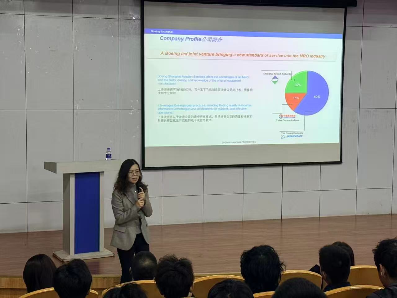 上海波音高度重视此次宣讲,派出人力资源总监、高级大修经理、工程技术总监等多位部门负责人亲临现场。通过企业宣传视频播放、英国皇家航空学会介绍、优秀学长经验分享、项目流程讲解及现场问答等环节,全面展示了“波音学徒制班”的培养特色与航空维修行业的广阔前景。特别是在介绍波音对未来十年机务人员需求预测时,学生们深刻感受到行业快速发展带来的广阔就业空间。