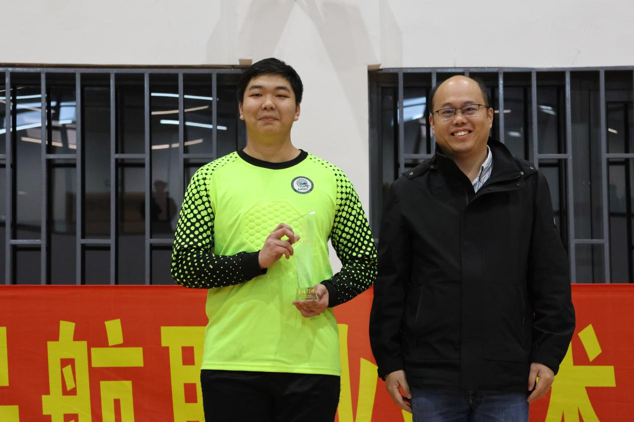 飞机制造与维修学院副院长王志豪为最佳门将彭会杰颁发奖杯