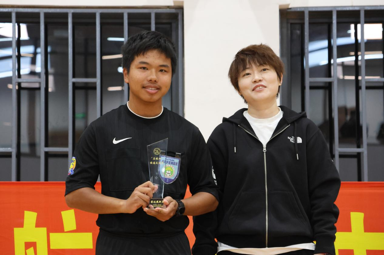 裁判长袁玮老师为最佳裁判员徐之迅颁发奖杯
