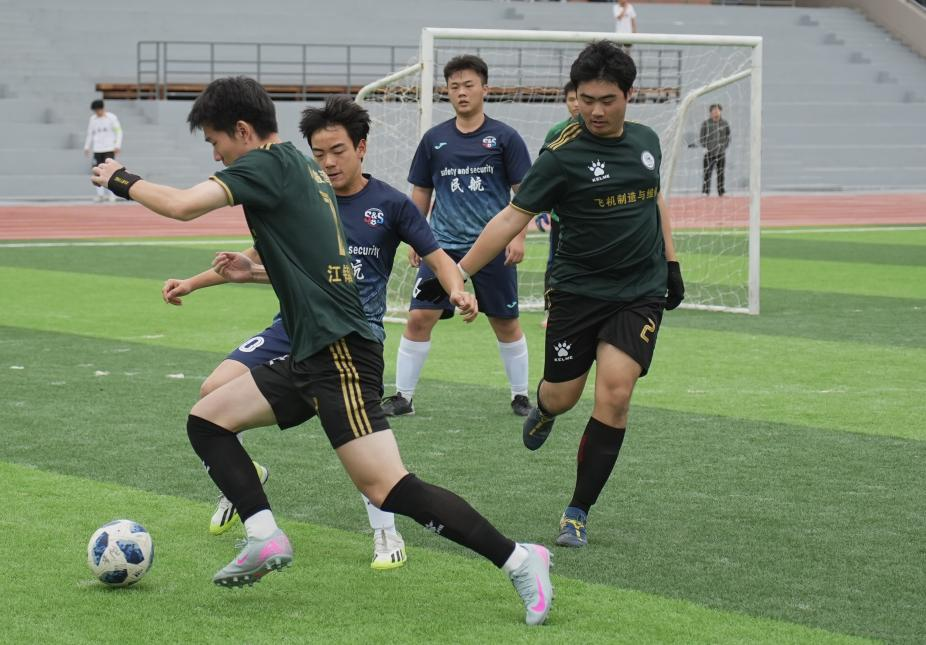 民航运输学院代表队以稳固的防守反击策略应对,中场球员灵活调度,多次化解危机并发起快速反攻;飞机制造与维修学院代表队队员们如同日常对待精密机械般专注,传球精准、配合严谨;通用航空与无人机学院以严谨的防守、绝妙的配合,为比赛献上了多次精彩瞬间。